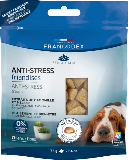 Заспокійливі ласощі FRANCODEX містять L-триптофан. Організм використовує цю амінокислоту для виробництва серотоніну, нейромедіатора, який допомагає заспокоїти гіперактивних, нервових чи тривожних собак без побічних ефектів чи залежності. Крім того, ласощі також містять екстракти меліси та ромашки, відомі своїми заспокійливими властивостями. Ці ласощі особливо підходять для щенят у поєднанні з дресируванням з позитивним підкріпленням, щоб зменшити стрес у перші дні у їхньому новому будинку.